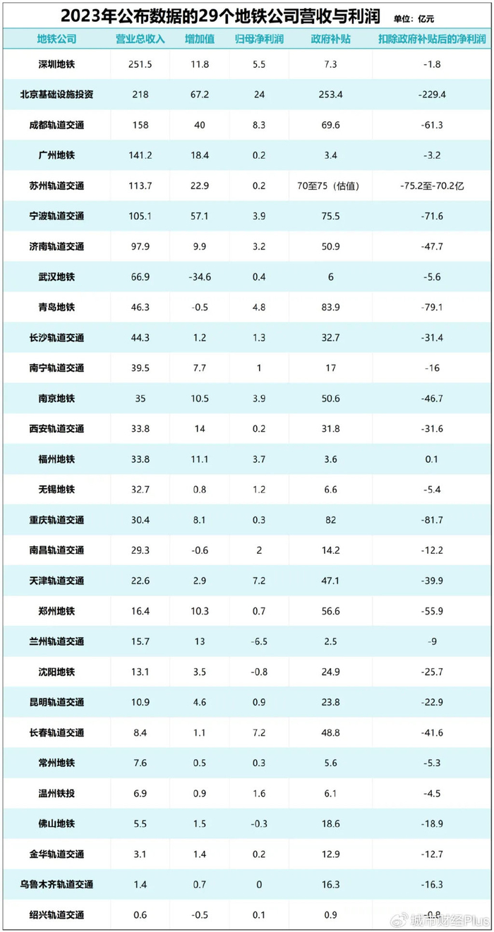 去年我就梳理过公布2023年数据的29个城市(上海、杭州、东莞等城市未公布数据),如扣除政府补贴,实际利润28个在亏损。
