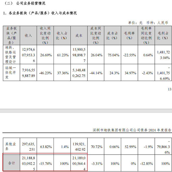 当然,从深圳地铁本身的财报来看,受房地产行情影响,其站城一体化业务的收入也在缩水,最终没能覆盖成本,也出现了一丢丢亏损。