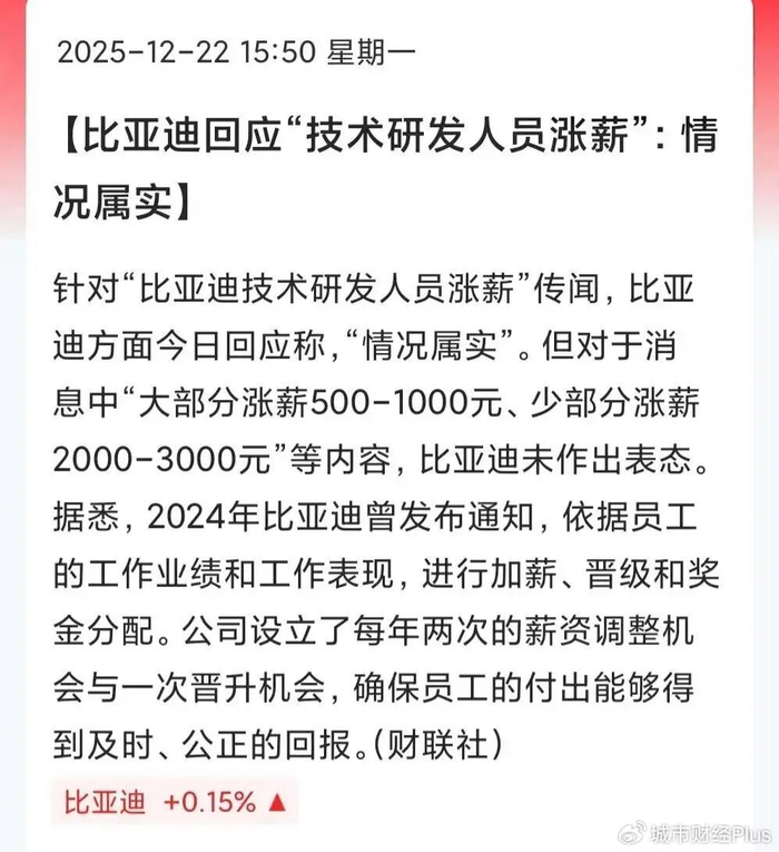 比亚迪针对技术研发人员的涨薪多数涨幅在1000元左右,也有几百元和两三千的涨薪,对于不同职位可能有不同的涨薪标准。