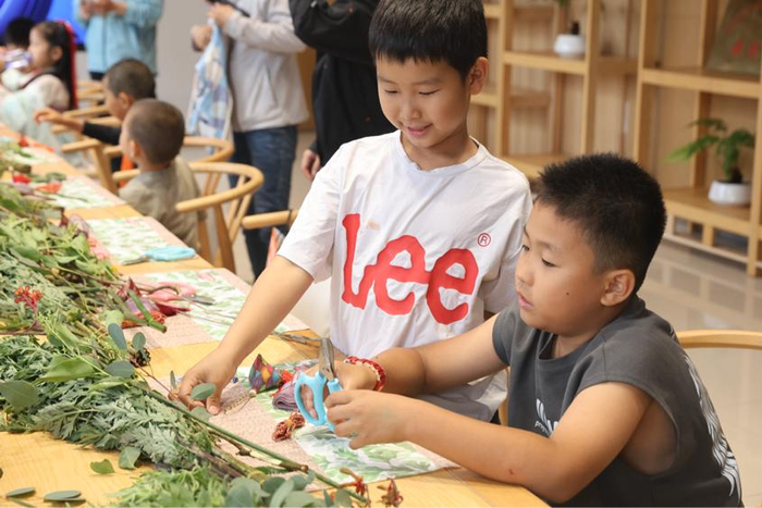 在“二十四节气文化沉浸体验”环节中,“端午门挂DIY”与“竹编龙舟DIY”同步展开。20组家庭在老师指导下,用艾草、菖蒲编织驱邪纳福的门挂,以柔韧竹条塑形象征团结的龙舟。孩子们在穿针引线、编绕扎结间,亲身体验“艾草避秽”“龙舟精神”的文化寓意,将传统文化转化为可触可感的童年记忆。