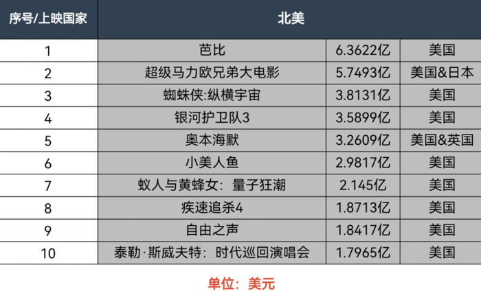 2023年上榜电影中比较特别的是改编自真实案件的犯罪电影《自由之声》和泰勒·斯威夫特的演唱会大电影。受2023下半年好莱坞罢工潮的影响,多部电影将推迟上映,2024年能完成制作并上映的好莱坞电影的数量也在减少,这将对新一年的北美票房产生很大影响。