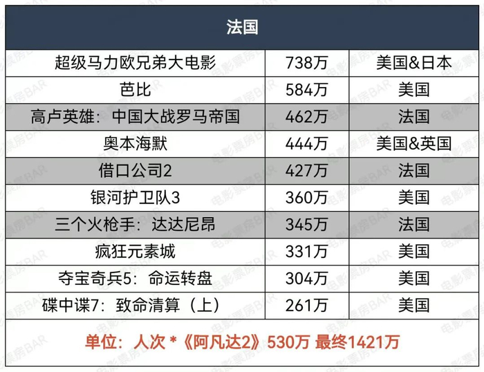 2022年欧洲各国前十电影榜被好莱坞电影全占的情况在2023年有所改善。电影起源国法国年榜前十的法产电影达到3部,德意西前十榜中也出现了自己的国产电影,这些非好莱坞电影中,喜剧片占比较高。