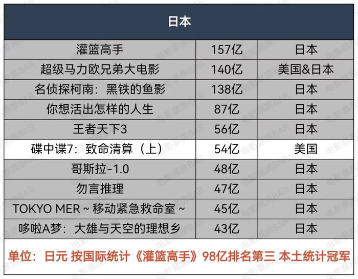日本2023年票房前十的电影中纯日产电影占8部(真人电影高达4部),还有一部全球年亚的美日合拍片《超级马力欧兄弟大电影》,纯美产电影只有一部《碟中谍7》。