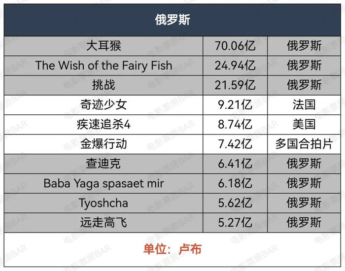 《疾速追杀4》在俄罗斯的首映票房达到430万美元,比第三部还高出33%,俄罗斯影迷似乎并没有因为俄乌大战对好莱坞电影产生抵触情绪。杰森·斯坦森的合拍片《金爆行动》也进入榜单,俄罗斯对硬汉没有抵抗力。
