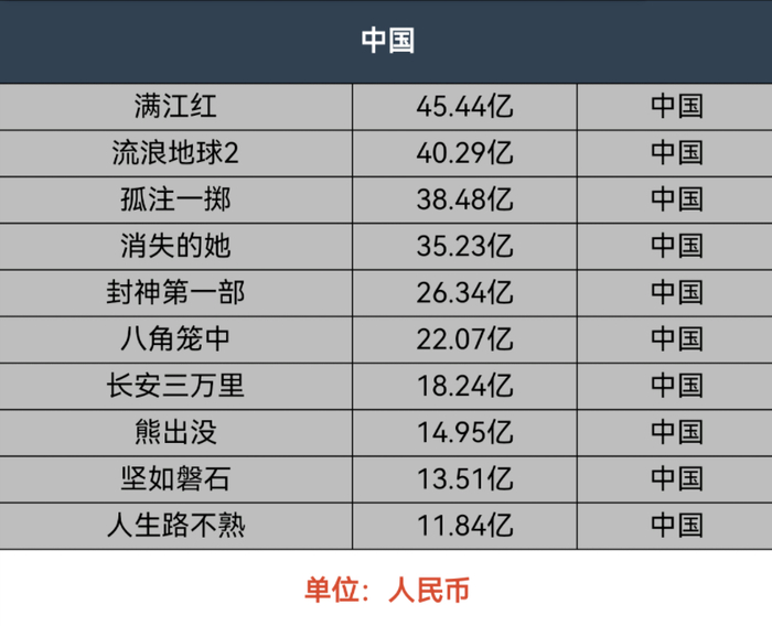 除北美外,中国是唯一实现票房前十电影全国产的国家。前十电影中包含古装、科幻、现实、悬疑、动画等各类题材,小成本电影的票房表现出色,大制作电影如《流浪地球2》、《封神第一部》的工业化也在慢慢成熟。