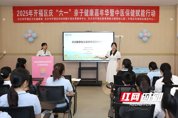 健康讲座。在中医保健赋能行动中,湖南省妇幼保健院专家采用“理论+实操”模式,深入讲授小儿推拿调理脾胃等中医适宜技术,家长和老师们认真学习,掌握科学实用的中医保健技能。培训结束后,现场发放驱蚊中药香囊,兼具防蚊健康功效与中医药文化韵味。