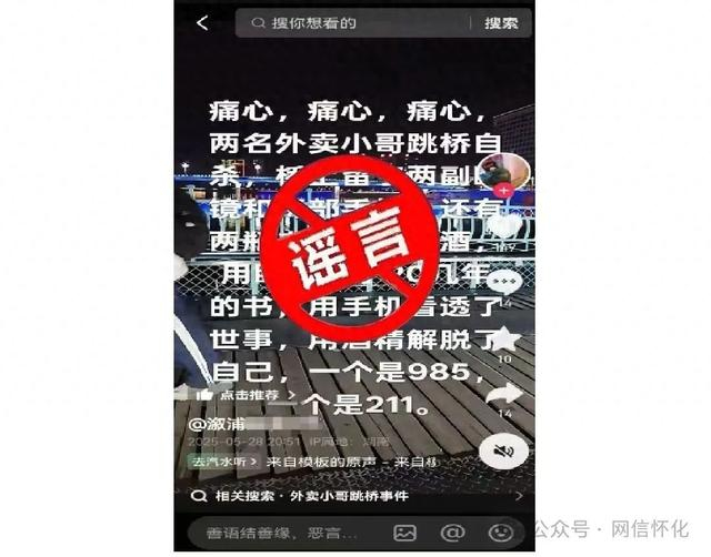 5月28日,溆浦网民覃某为博取网民关注,以溆浦浮桥画面为背景,配以“痛心,痛心,痛心,两名外卖小哥跳桥自杀,桥上留了两副眼镜和两部手机,还有两瓶未喝完的啤酒,用眼镜读了20几年的书,用手机看透了世事,用酒精解脱了自己,一个是985,一个是211”文案,通过其账号“溆浦县***气”发布该视频。视频发布后,迅速引发不明真相的网民关注和热议,相关虚假信息在网络上扩散,造成了不良社会影响,严重扰乱了公共秩序。溆浦县网信办联合公安机关迅速介入调查,经核实确认该视频内容纯属捏造。