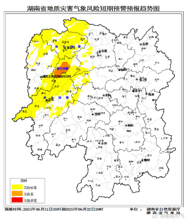 自6月21日20:00至22日20:00,受降雨影响,湘西北的怀化部分山地丘陵区发生突发性地质灾害风险高橙色预警;湘西、湘西北的常德、张家界、益阳、怀化、娄底、湘西土家族苗族自治州等市州山地丘陵区发生突发性地质灾害风险较高黄色预警。