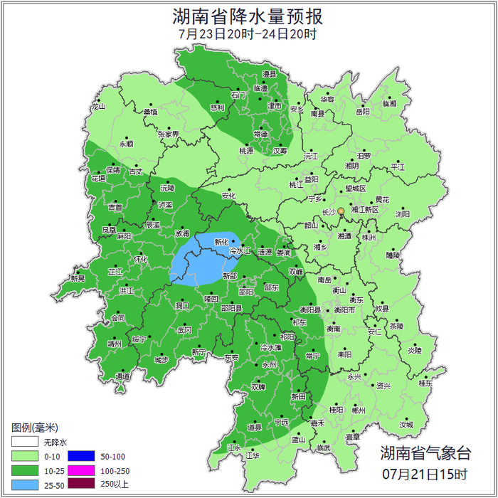 23日晚上至24日白天,多云有小到中等阵雨或雷阵雨,其中怀化东部、邵阳北部、娄底西部局地大雨;北风2~3级,雷雨时阵风7~9级;最高气温31~35℃,湘西南26~30℃,最低气温23~26℃。