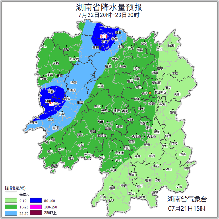 22日晚上至23日白天,湘东、湘南多云有阵雨或雷阵雨,其他地区阴天有中到大雨,其中常德北部、张家界东部、湘西州南部、怀化中北部部分地区有暴雨;北风2~3级,局地阵风7~9级;最高气温28~32℃,最低气温23~25℃。