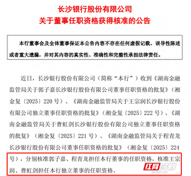 根据湖南金融监管局发布的任职资格批复文件,郭子嘉、程青龙担任该行董事,王宗润、曹虹剑担任独立董事。
