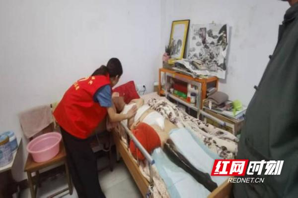 活动后,护士长易兰淋与安宁疗护专科护士吉慧芬前往冷水滩区福善街的肖奶奶家中,提供居家安宁疗护服务。肖奶奶病情进展,并发右下肢湿性坏疽,家属在护理与心理方面存在困难。易护士长结合伤口门诊专家意见,给予专业处理与心理疏导,将医疗关怀延伸至家庭,传递生命末期的温暖与尊严。