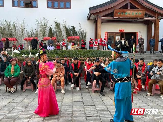10时许,活动尚未正式启动,食堂外的便民服务专区已提前“热场”。剪发、健康体检、铁锅修补等实用服务台一字排开,写春联摊位前墨香四溢,大学生手工展台吸引不少群众。10点30分,文艺汇演正式上演,豫剧、花鼓戏选段等轮番表演,男女声独唱点燃气氛,为志愿者们送上了专属文化盛宴。