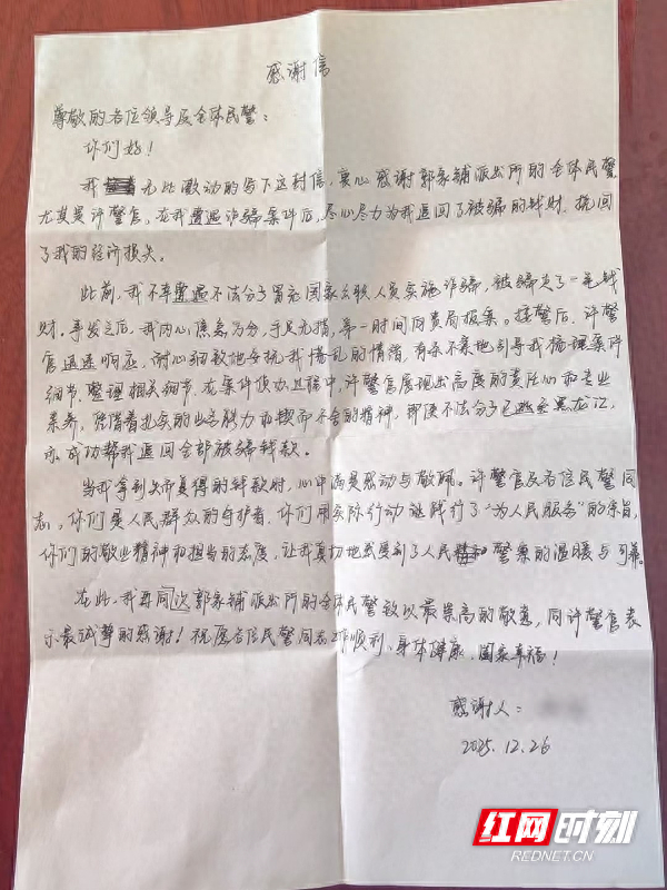 红网时刻新闻12月30日常德讯(通讯员 娄蔓莉)12月26日,鼎城区郭家铺派出所收到了一封特殊的感谢信。这起事件,还要从几个月前说起。
