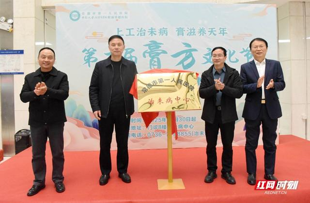红网时刻新闻12月30日常德讯(通讯员 宋文名)12月30日,常德一医第二届膏方文化节暨治未病中心揭牌庆典在门诊楼一楼举行。常德一医党委书记向勇志,党委副书记、院长李德辉,党委委员、芷园宾馆总经理肖泽民,中西医结合科主任沙永新共同为治未病中心揭牌。