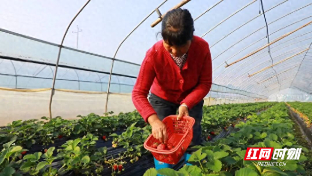 红网时刻新闻12月30日郴州讯(通讯员 贺英杰 雷一杰 樊鑫宇)在北湖区华塘镇塔水村的草莓种植基地里,一颗颗饱满鲜红的草莓挂满枝头,种植户们正忙着采摘、分拣、一派丰收忙碌的景象。