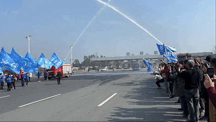 一场精心准备的欢迎仪式瞬间开启——两侧消防车同时发力,喷出高高的水柱,在空中交汇成一道壮观的水门。阳光透过纷扬的水雾,映出一道淡淡的彩虹,如梦如幻。冠军大巴平稳地穿过这扇水与光交织的拱门,接受着道州人民给予英雄的最高礼遇。