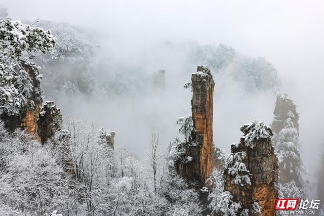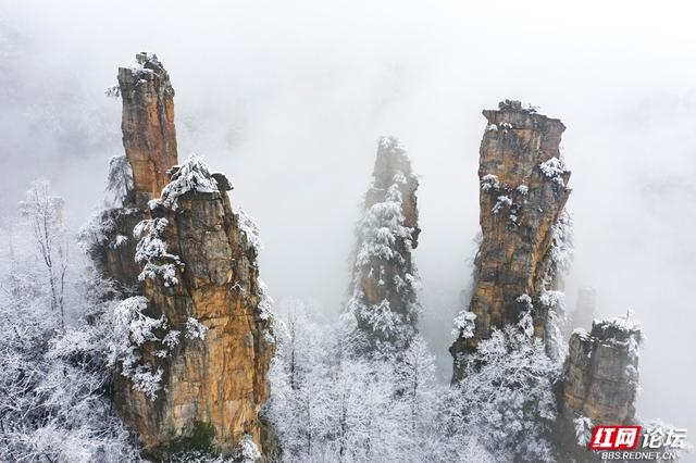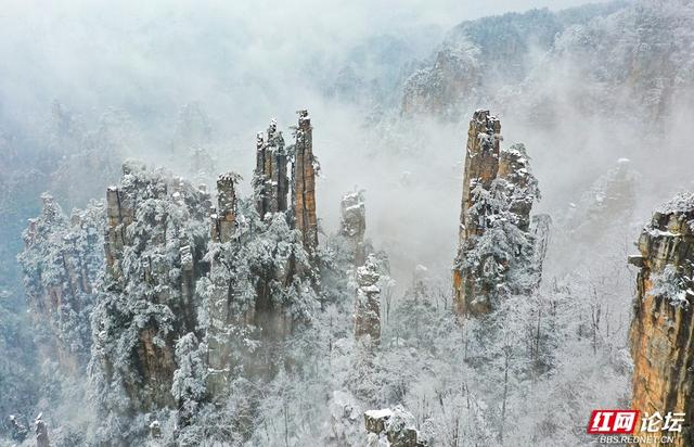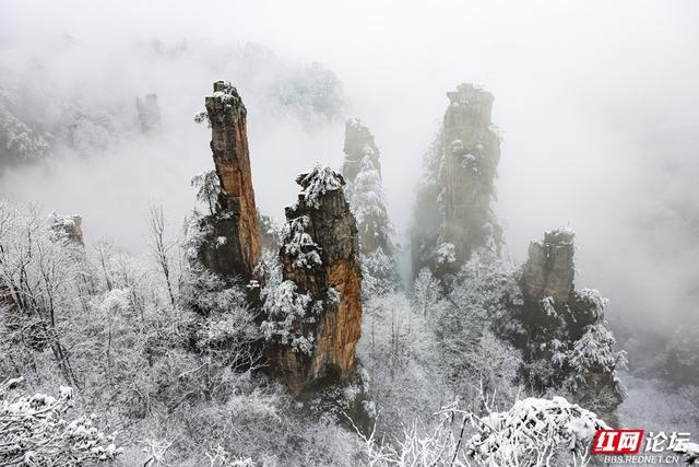 2026年1月1日,张家界武陵源恍若天地未醒的雪梦,碎玉纷披,峰林如缀,山色被晨风轻轻揉皱,在寂静中铺展成一片银色的仙境。