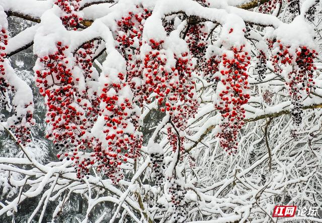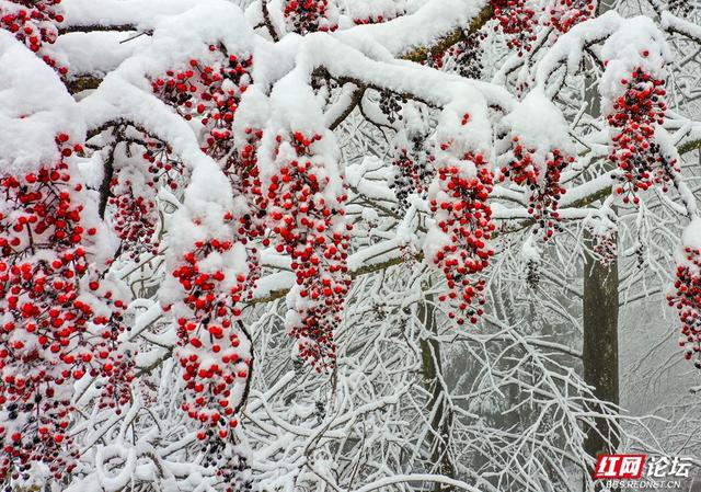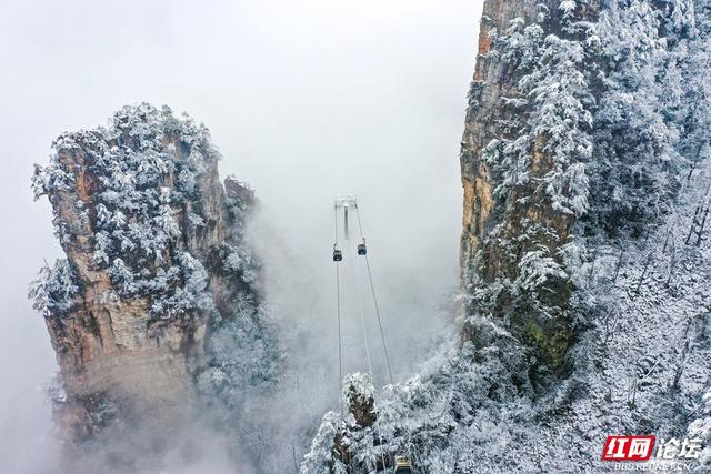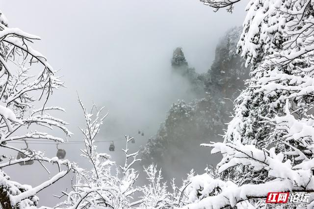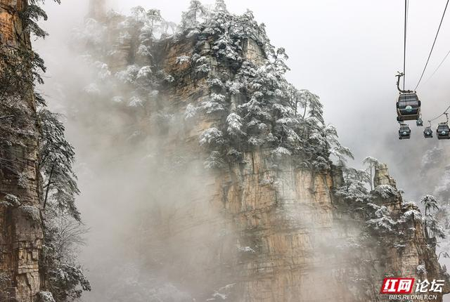 石柱峰林披着蓬松的雪衣,雾岚在峭壁间轻轻游移,连枯枝也缀满银色的诗行,静立成冬日的低语。缆车穿行于琼枝玉树之间,细雪随风扑打车窗,簌簌如时光的轻诉;游人踏碎石阶上的霜痕,惊起枝头簌簌抖落的雪雾,恍若捧起半空碎落的冬光。