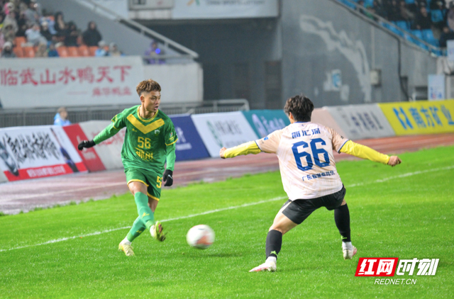 比赛于19时38分正式打响,开场后郴州队攻势迅猛。第4分钟,55号李章毓禁区弧顶怒射击中横梁;第12分钟,他又在角球进攻中抢点攻门,被对方门将奋力化解。大湾区湖南人队不甘示弱,第37分钟由47号李智龙制造并主罚点球命中,率先打破僵局。