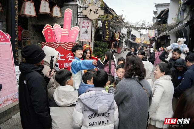 在这里,老长沙民俗文化通过创新形式焕发新生机。“靖港太好玩了!”萌娃们在定向寻宝中化身“小探险家”,在射箭、投壶、踢毽子、锤钉子等传统游戏里尽情撒欢;全家一起猜灯谜、做糖画,传统年俗在互动体验中变得鲜活可触。街巷中,福禄寿喜“吉祥四宝”、派发好运的财神等NPC天团,为游客送福气惊喜互动,不少家长赞叹道:“孩子追着‘财神’跑了半条街,这种沉浸式体验太有意思了。”
