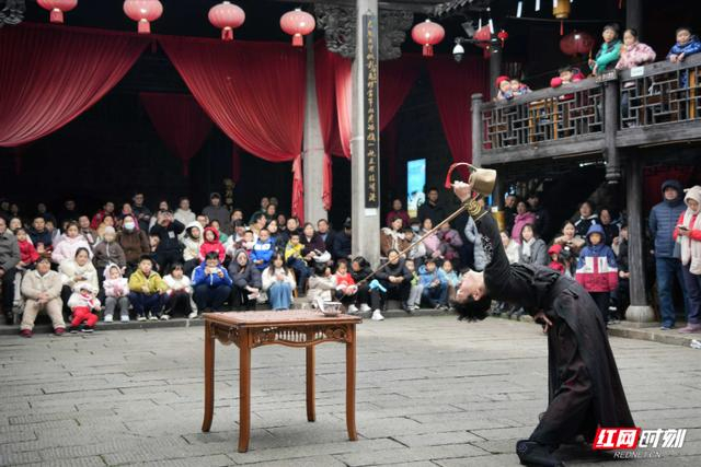 元旦假期,靖港古街张灯结彩、处处是戏、人流如织,洋溢着节日的欢声笑语。楚河码头化身开放式舞台,“潮韵戏元旦”联谊派对嗨不停,魔术、劲舞、旗袍秀与乐队表演轮番登场,台下全家老小随着音乐一起摇摆;八元堂里湘韵悠扬,变脸喷火绝技赢得阵阵喝彩,孩子们兴奋举着手机拍照;黄金年代剧场的复古派对乐翻天,陶承故居里演绎着感人至深的大爱故事,古桥上湘韵戏影演绎东方美学,老街中喜嫁迎亲传递着喜悦……非遗民俗与当代演艺在满镇自然生长,全域漫游、步步皆景,真正实现了“满镇都是戏”的畅快体验。