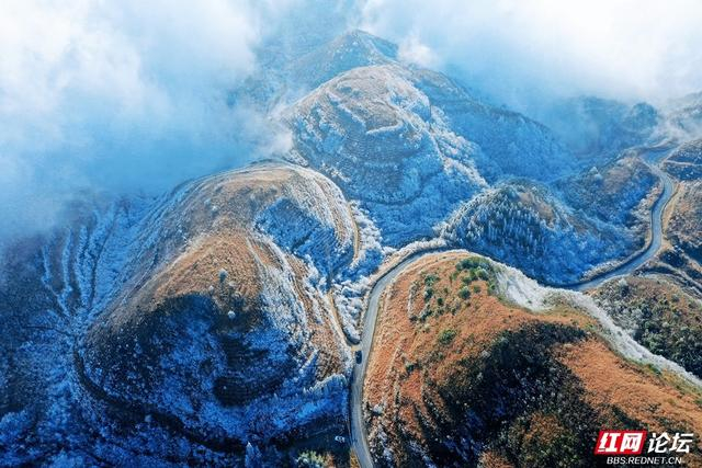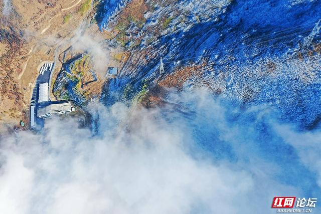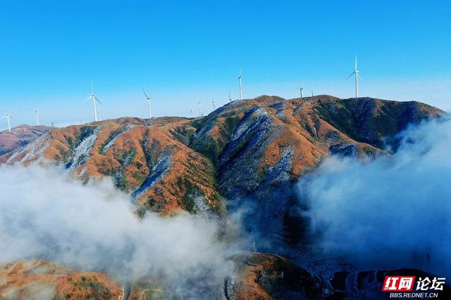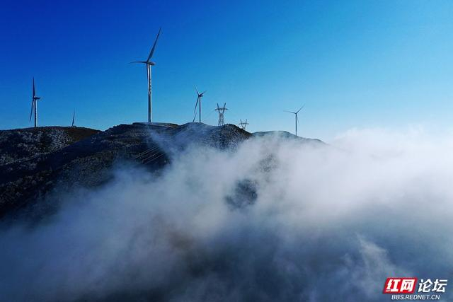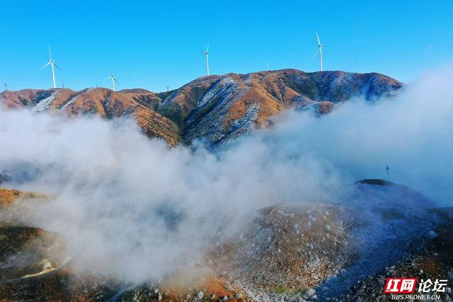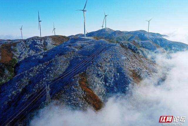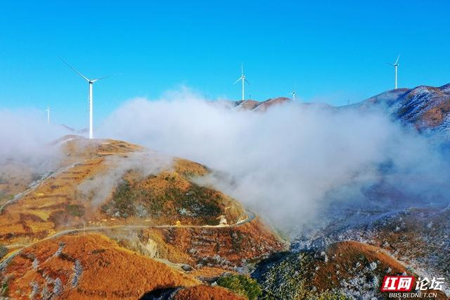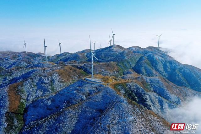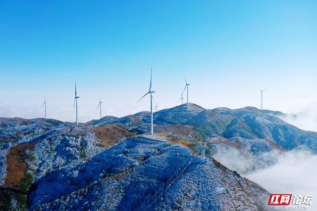 2026年1月2日的午后,桂东县的万洋山迎来了今年第一场雪。雾凇悄然攀上枝梢,为连绵山野织就一层细碎的白绒。橙褐的草坡与淡蓝的冰花在风中轻轻相撞,似低语,似叹息。蜿蜒的山路覆着薄霜,偶有车辙碾过,搅动山间游走的云气。风电机组静立云海之畔,叶片缓缓旋转,不时将碎雪抖落进漫山流雾,仿佛把寂静撒向了更远的山谷。