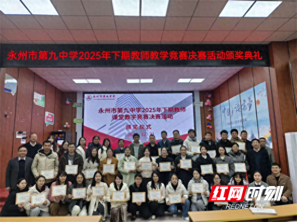 红网时刻新闻1月8日讯(通讯员 唐艳红 黄小峰)寒冬岁末,暖意融融。近日,永州市第九中学立德讲堂内灯光璀璨、气氛热烈,学校2025年教师教学竞赛决赛颁奖仪式举行。学校校级领导莅临现场,全校50名获奖教师、各学科评委及教师代表齐聚一堂,共同见证荣耀时刻。