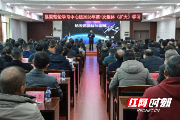 红网时刻新闻1月8日讯(通讯员 卓宇斌 刘姣)1月7日,新田县委理论学习中心组开展2026年第1次集体(扩大)学习,特邀正师职大校、一级航天员陈全作《航天员选拔训练与载人航天精神》专题授课。新田县委书记陈雄主持并讲话,县委副书记、县长黄永英等县委理论学习中心组成员参加学习。
