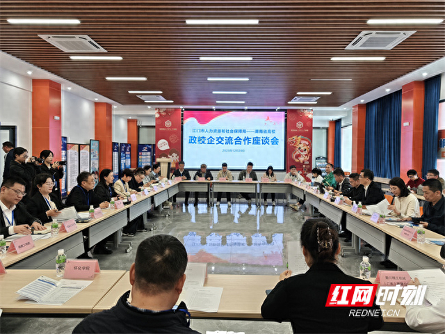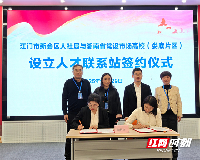 活动期间,调研代表团与江门市人力资源和社会保障局、江门市新会区人力资源和社会保障局、企业代表举行政校企交流座谈会。会上,湖南人文科技学院作为湖南省高校常设市场(娄底片区)牵头单位,与新会区人力资源和社会保障局正式签署了《设立人才联络站合作协议》。重点围绕产业人才政策、校地供需对接、校园招聘等方面达成共识。