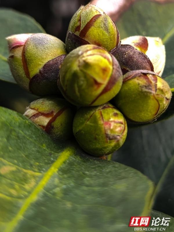 我俯身细瞧,有的花苞挺立枝头,似蓄势待发的鼓点;有的隐在叶底,半遮半掩,添了几分俏皮。风过处,枝叶轻颤,花苞们便你碰我、我蹭你,倒像在排练一场集体登场的仪式。它们不曾争春,却在隆冬里悄悄集结,把积攒了一秋的力气,都凝在这圆滚滚的骨朵里。