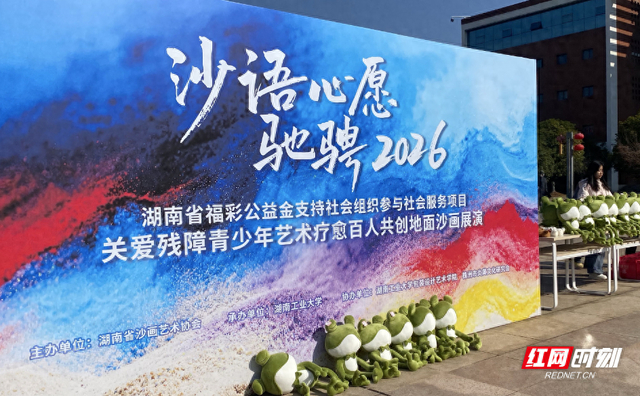 红网时刻新闻1月10日讯(记者 陈雅如)1月8日下午,“沙语心愿・驰骋2026”关爱残障青少年艺术疗愈百人共创大型地面沙画展演,在湖南工业大学喷泉广场举行。
