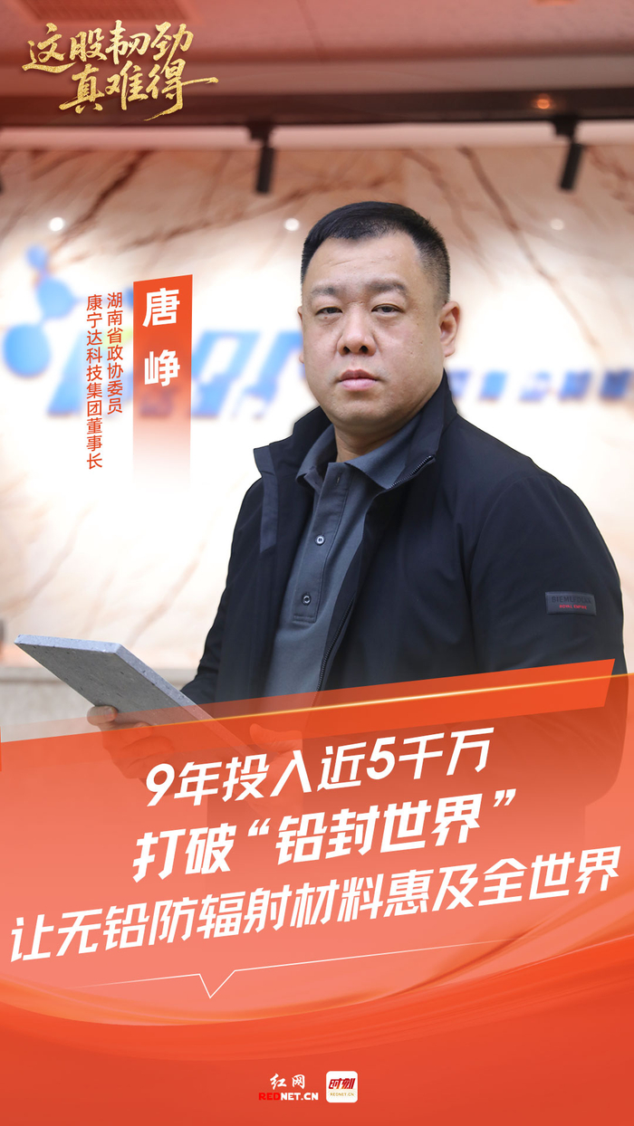 湖南省政协委员、康宁达科技集团董事长唐峥。出乎所有人意料,一家原本只安装防辐射铅板的小公司,几乎彻底改写了这个行业的规则。从被专家断言“找死”到产品出口40个国家和地区,湖南省政协委员、康宁达科技集团董事长唐峥,带领团队在技术无人区摸索近十年,实现了防辐射材料领域的关键突破。2025年冬,一批康宁达科技集团(以下简称“康宁达”)生产的无铅防辐射板材,经上海港运往德国汉堡,即将安装进欧洲的医院。仅这一年,康宁达的产品新进入了35个国家和地区,出口规模突破亿元。“这不是创新,这是找死”回想起2011年的那个下午,唐峥记忆犹新。一位专家直言:“前方注定是死路一条,这不是创新,是找死!”彼时,唐峥接手康宁达才两年。用他的话形容,公司更像一个销售团队,干的是医院“装修队”的活儿。但他偏偏萌生一个念头:创造一种新型防辐射材料——无毒、易加工安装、安全环保,关键是成本更低,用以替代传统铅板。他的初衷很朴素:让所有基层医院都用得起可靠的防辐射材料,为医护人员和患者提供更可及的安全保障。2011年,作为湘潭市政协委员,唐峥承接了一项课题,调研了省内超100家基层医疗卫生机构。结果发现,因传统铅板安装复杂、成本高昂,许多基层机构承受着巨大的资金压力,甚至存在医护人员暴露于辐射风险的可能。“这个需求真实而迫切,我们愿意做第一个吃螃蟹的人。”唐峥说。