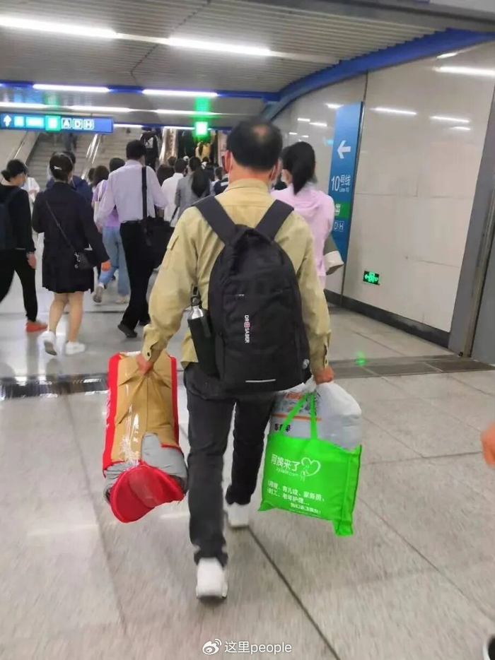 北京地铁7号线倒10号线的通道里,我看见了这样的一个背影。