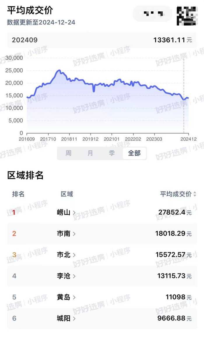 最后就是,崂山区和黄岛区等产业核心区的房价已经稳住了。比如崂山区,2024年,成交均价上涨了5.9%。而黄岛基本持平。跌得最惨的是市南和市北,属于老富人区,泡沫的最后一轮挤出。