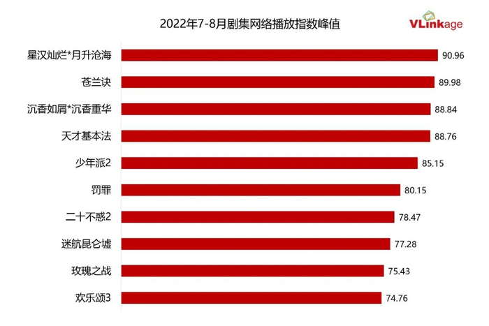 下图为2022年7-8月首播剧集热度Top10,三大古装剧承包三甲。其中《星汉灿烂·月升沧海》以90.96的网络播放指数排名第一,成为暑期档关注度最高的爆款之一,也是同期唯一一部网播指数峰值突破90的剧集。