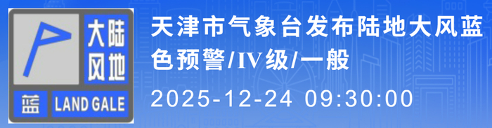 天津市气象台于2025年12月24日09时30分发布陆地大风蓝色预警信号:预计今天傍晚到夜间,我市将有西北风4-5级阵风7级,山区和东部沿海局地阵风8级,请有关单位和人员做好防范准备。