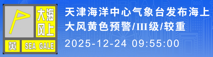 天津海洋中心气象台于2025年12月24日09时55分发布海上大风黄色预警信号:预计今天夜间,天津港海域、南港海域、天津港锚地海域、渤海中部海域将有偏北风7-8级阵风9-10级,明天上午减弱为6-7级阵风8级,请有关单位和人员做好防范准备。