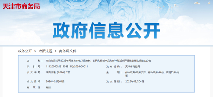 2月4日,天津市商务局发布关于2026年天津市家电以旧换新、数码和智能产品购新补贴活动开通线上补贴渠道的公告。市商务局定于2月6日11时起开通我市家电以旧换新、数码和智能产品购新补贴活动线上补贴渠道,按月定量发放线上渠道补贴资格兑换券。