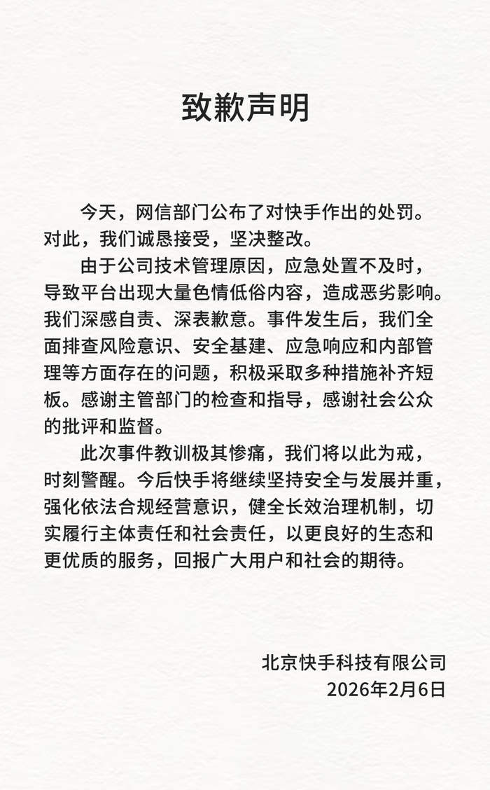 今天,网信部门公布了对快手作出的处罚。对此,我们诚恳接受,坚决整改。