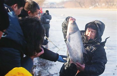 上午9时许,青盛河畔人头攒动,村民和游客将目光齐刷刷地锁定在冰面中央。只见身着棉服、脚蹬胶靴的渔民手持冰镩向下发力,冰屑飞溅,不一会儿就凿出硕大的冰洞。随着渔网沉入水中,观众的期望值也被拉满。经过一段时间的等待,冰面上传来领头人“起网”的号令,几名渔民齐声应和,合力收拢缆绳。紧接着,平静的冰面传出搅水声,一片银光跃出水面,肥美的花鲢、白鲢在网中翻腾跳跃。