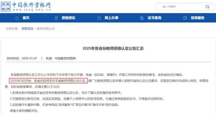 2025年3月开始,各省份陆续发布本省教师资格认定公告。