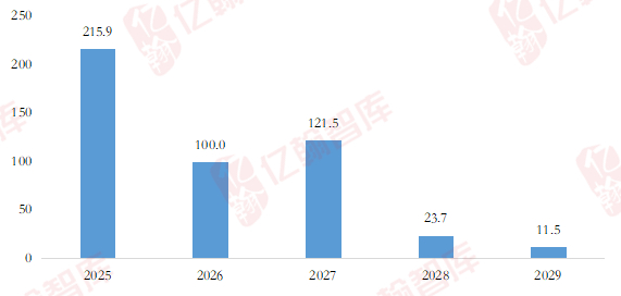 图表:万科存续公开债到期分布(公司债+中期票据)(亿元)