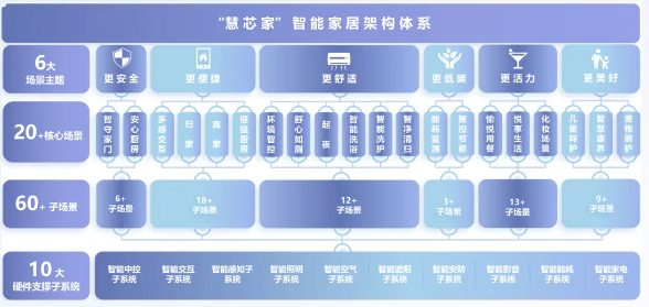 中交地产"慧芯家"打造"场景+空间+技术"架构,涵盖安全、交互等6大场景,开发60+功能如AI跌倒监测、车家智联;集成10大硬件系统,适配批量交付及样板展示,实现"一屏全控"等智慧体验。