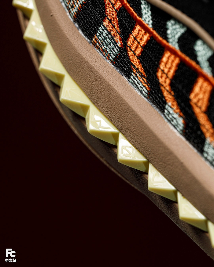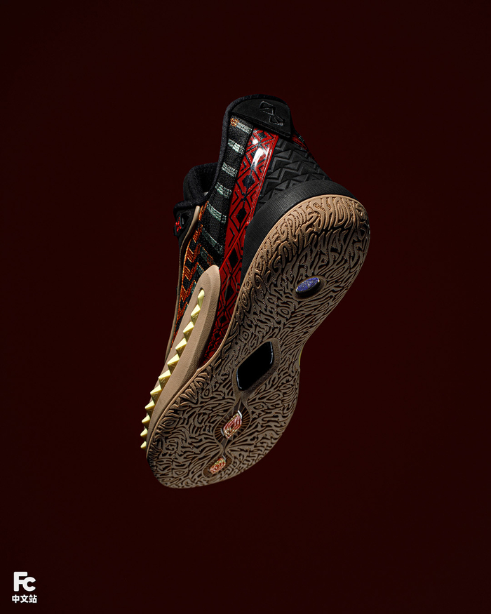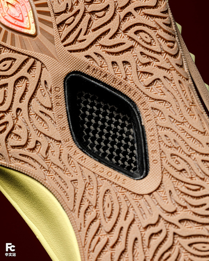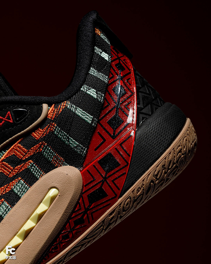 后跟环绕式TPU依旧延续部落主题,内部饰有花纹,但与鞋面是截然不同的纹样,进一步丰富层次。