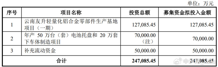 据招股书显示,友升股份本次拟募集资金247,085.45万元,募集资金扣除本次发行费用后将用于云南友升轻量化铝合金零部件生产基地项目(一期)、年产50万台(套)电池托盘和20万套下车体制造项目、补充流动资金,具体如下: