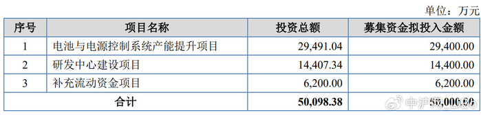 据招股书显示,沛城科技本次拟募集资金50,000.00万元,募集资金扣除本次发行费用后将用于公司电池与电源控制系统产能提升项目、研发中心建设项目、补充流动资金项目,具体如下:
