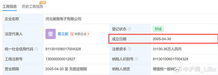 据冀雅电子工商信息显示,冀雅电子成立于2005年4月,从时间上可以看出,郑卫涛开始任职于冀雅电子的时间比冀雅电子成立的时间足足早了9年之多。
