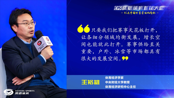 然而,这种高速发展和增长的背后,是我国体育产业结构的不均衡。具体来说,以健身休闲和体育培训为代表的参与性产业增速很快,而传统竞赛表演业则增长相对缓慢。王裕雄教授认为,只要我们把赛事天花板打开,让各细分领域均衡发展,增长空间也能就此打开。赛事供给至关重要,户外、冰雪等市场都具有很大的发展空间。