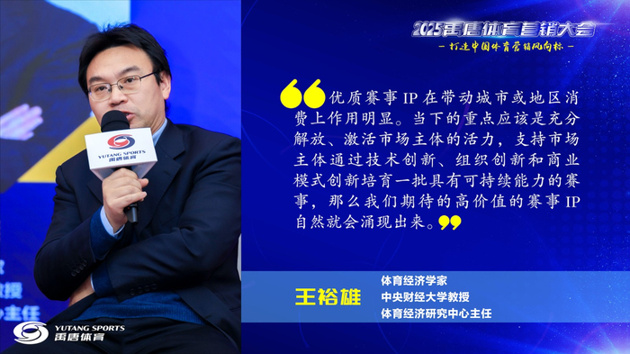 在主题为“赛事经济:体育市场如何乘势体育消费政策东风”的圆桌论坛中,体育经济学家、中央财经大学教授、体育经济研究中心主任王裕雄教授和凯兴资本合伙人、多家体育公司战略顾问、全国青少年体育联合会顾问辛颖共同探讨体育消费政策对体育营销市场的影响、文商体旅融合的市场新机会等话题。